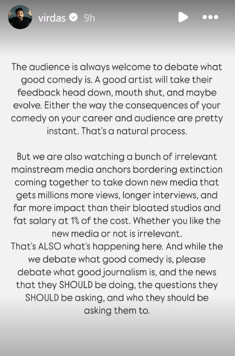 वीर दास ने आगे लिखा, "लेकिन हम यह भी देख रहे हैं कि पुराने मीडिया एंकरों का एक समूह वे नए मीडिया को खत्म करने के लिए निशाना बना रहे हैं, जिन्हें उनके बड़े स्टूडियो और 1 प्रतिशत लागत पर मिलने वाले मोटी सैलरी की तुलना में लाखों अधिक व्यूज, लंबे साक्षात्कार और कहीं अधिक प्रभाव मिलता है। आपको नया मीडिया पसंद है या नहीं, यह बेमतलब है।"