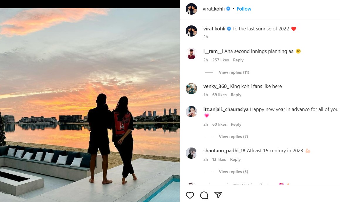 टीम इंडिया के पूर्व कप्तान विराट कोहली अपने परिवार के साथ दुबई में साल 2022 का अंत और नए साल का स्वागत करने के लिए पहुंच चुके हैं। दोनों ने अपने-अपने सोशल मीडिया हैंडल इंस्टाग्राम पर वेकेशन से कुछ तस्वीरें शेयर कीं हैं। विराट कोहली ने अनुष्का शर्मा और वामिका के साथ फोटो शेयर किया, जिसके कैप्शन में उन्होंने लिखा कि वह साल 2022 के आखिरी सनराइज को देख रहे हैं।