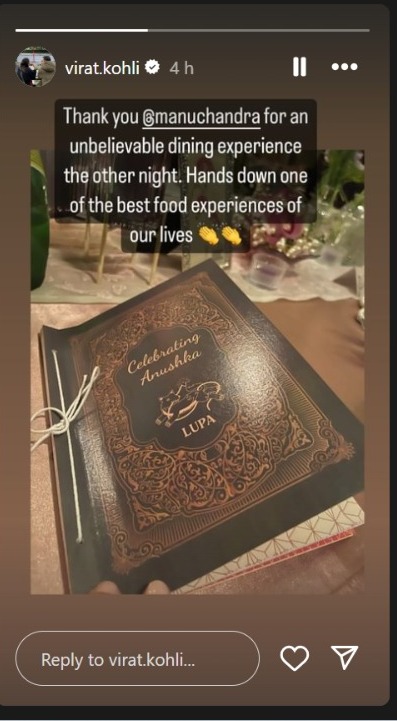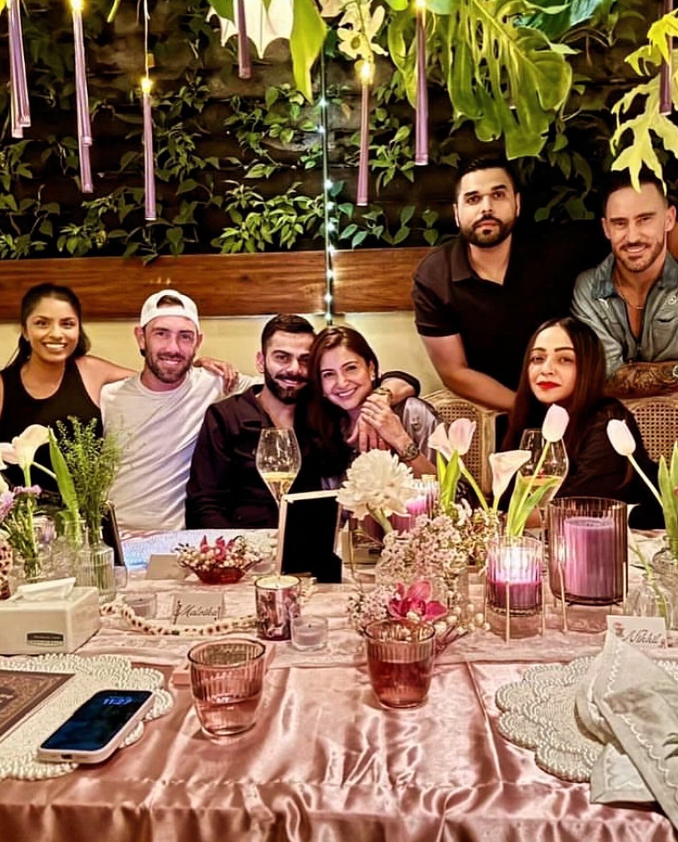 इस तस्वीर में आपको विराट कोहली, अनुष्का शर्मा, ग्लैन मैक्सवेल और फेफ डुप्लेसिस की झलक आसानी से देखने को मिल जाएगी। आरसीबी के कैप्टन ने लिखा है- एक गजब की रात, शानदार लोगों के साथ। इसके अलावा विराट कोहली ने भी अपनी इंस्टा स्टोरी में बेंगलुरू के लुपा रेसटोरेंट को थैंक्यू बोलते हुए तस्वीर शेयर की है।