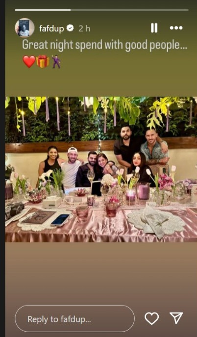 1 मई को अनुष्का शर्मा को जन्मदिन मनाया जाता है। ऐसे में इस बार अपने बिजी क्रिकेटिंग शेड्यूल से समय निकालते हुए विराट कोहली ने बीती रात 3 मई को अनुष्का के बर्थडे का जश्न मनाया है। इस मौके की एक तस्वीर को रॉयल चैलेंजर्स बेंगलुरू टीम के कप्तान फेफ डुप्लेसिस ने अपने ऑफिशियल इंस्टाग्राम हैंडल की स्टोरी में शेयर की है।
