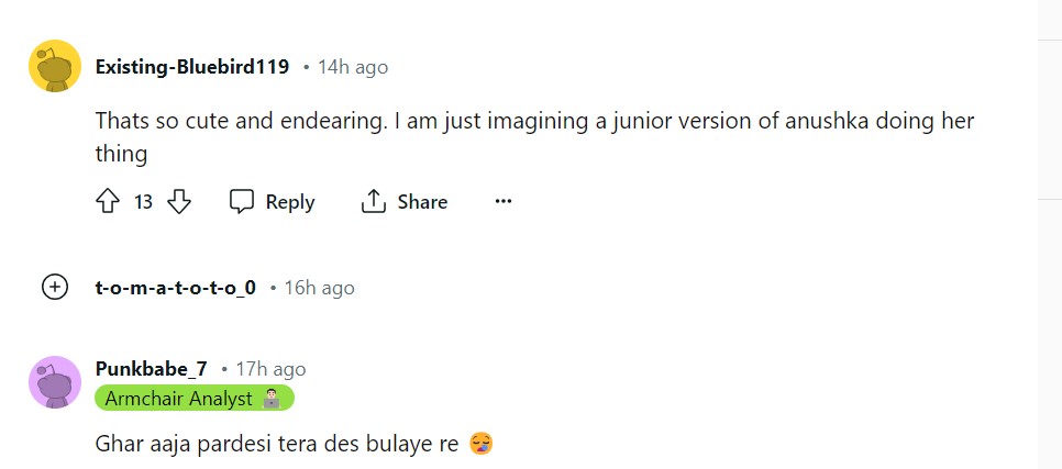 एक यूजर ने कमेंट किया, 'पापा के साथ थोड़ा टाइम बिताते हुए, जबकि मां और भाई एक साथ होंगे। लेकिन जिसने भी ये फोटो ली, उसे इस तरह दखल नहीं देना चाहिए था।' एक ने लिखा, 'ये क्यूट है, लेकिन उनकी इजाजत के बिना फोटो लेना भी काफी रूड बिहेवियर है।' एक ने कमेंट किया, 'ये कितना क्यूट है। मैं जूनियर अनुष्का को ये सब करते सोच रहा हूं।'