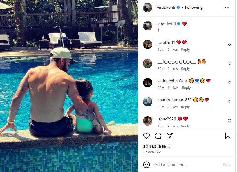 इस दौरान विराट ने व्हाइट रंग की कैप लगाई हुई है, तो वहीं चोटी बांधे नन्हीं वामिका सी-ग्रीन और पिंक रंग के स्विम सूट में बेहद ही प्यारी लग रही हैं। इस फोटो को शेयर करते हुए विराट कोहली ने कैप्शन में हार्ट वाला इमोजी पोस्ट किया।