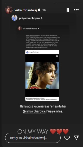 विशाल ने अपनी लिखी कविता की पंक्तियां भी शेयर कीं। कविता की पंक्तियां हैं, ‘दूसरी जंग-ए-आदम को खत्म हुए भी बीते साल, अब भी कुछ जापानी अफसर छिपे मिले हैं ड्यूटी पर। तुम से कब मिलना होगा..., क्या अब भी नाराज हो तुम?’ विशाल के इतना लिखने के बाद प्रियंका भी स्वयं को प्रतिक्रिया देने से नहीं रोक पाई। उन्होंने इसे अपनी स्टोरी पर शेयर करते हुए लिखा, ‘आपसे कौन नाराज रह सकता है विशाल भारद्वाज? आइए मिलने।’