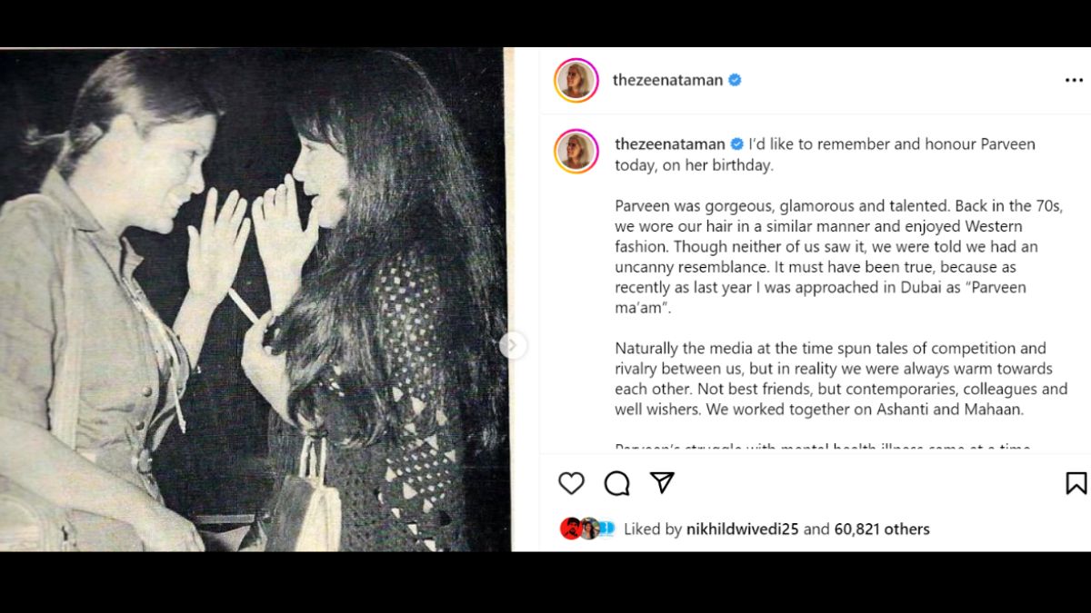 बीते साल जीनत अमान ने अपने ऑफिशियल इंस्टाग्राम हैंडल पर एक पोस्ट शेयर कर, जिसमें परवीन बाबी की तस्वीर भी शामिल थी। इस पोस्ट में परवीन संग अपने रिश्ते पर जीनत ने खुलकर बात की। इस दौरान उन्होंने बताया- हमारी शक्लें एक जैसी थीं, लोगों का मानना था कि हम जुड़वा बहनें हैं, लेकिन ऐसा नहीं था।