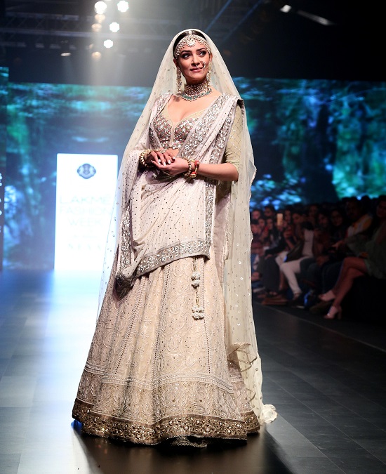 एम्ब्रॉइडेड लहंगे और दुपट्टे के साथ हाथफूल, मांगटीका, नेकलेस और झुमकों की भारी जूलरी पहन कर रैम्प पर उतरीं सुष ने वहां मौजूद लोगों की ख़ूब दाद पाई।
