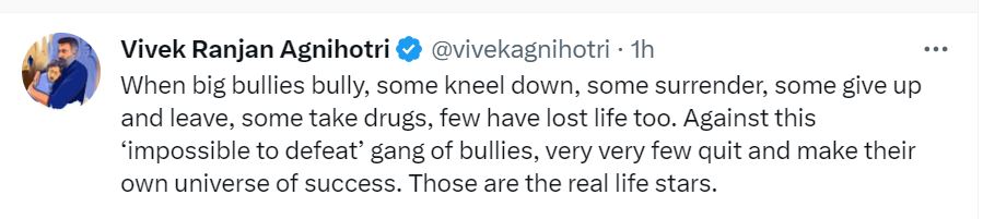 प्रियंका चोपड़ा के सपोर्ट में उतरे विवेक अग्निहोत्री ने एक आर्टिकल को शेयर करते हुए अपने ऑफिशियल ट्विटर हैंडल से ट्वीट किया, "जब बड़े-बड़े दबंग दबंगई करते हैं, तो कोई घुटने टेक देता है, कोई समर्पण कर देता है, कोई हार मान कर चला जाता है, कोई नशा करता है, कोई जान भी गंवा देता है। दबंगों के इस 'इंपॉसिबल टू डिफिट' गिरोह के खिलाफ, बहुत कम लोग इन्हें छोड़कर अपना एक अलग यूनिवर्स बनाते हैं। ये हैं रियल लाइफ स्टार।"