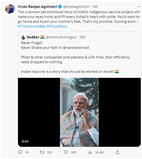 विवेक अग्निहोत्री को एक यूजर ने कहा कि इंडियन वैक्सीन की कहानी पत्थरों पर लिखी जानी चाहिए। इस ट्वीट पर निर्देशक ने दावे भरा जवाब लिखा। उन्होंने ट्वीट किया, 'अनकही लेकिन भावुक कर देने वाली इंडिया की वैक्सीन प्रोजेक्ट की कहानी आपकी आंखें नम कर देगी, और हर भारतीय को इससे गर्व होगा। आप घर जाकर अपनी मां के पैर छूना चाहेंगे। यह मेरा वादा है।'