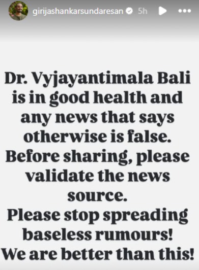 चेन्नई स्थित कर्नाटक संगीतज्ञ गिरिजाशंकर सुंदरेशन ने शुक्रवार को अपनी इंस्टाग्राम स्टोरी में लिखा,'डॉ. वैजयंतीमाला बाली का स्वास्थ्य सही है। इसके विपरीत अगर कोई खबर आ रही है तो वह बिल्कुल झूठी है। इस किस्म की खबर शेयर करने से पहले कृपया खबर के स्रोत की पुष्टि कर लें। बेबुनियाद अफवाहें फैलाना बंद करें। हम सब कुशल मंगल हैं'।
