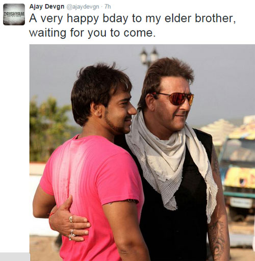 फिलहाल संजय दत्त 1993 के मुंबई हमलों के दौरान अवैध रूप से हथियार रखने के मामले में जेल की सजा काट रहे हैं। इस खास मौके पर उनकी पत्नी मान्यता दत्त ने जेल जाकर उनसे मुलाकात की। वहीं, उनके बॉलीवुड दोस्तों ने ट्वीट कर उन्हें विश किया। अजय देवगन ने ट्वीट में लिखा, 'मेरे बड़े भाई को हैप्पी बर्थडे। आपके आने का इंतजार है।' साथ में दोनों की एक फोटो भी पोस्ट की है।