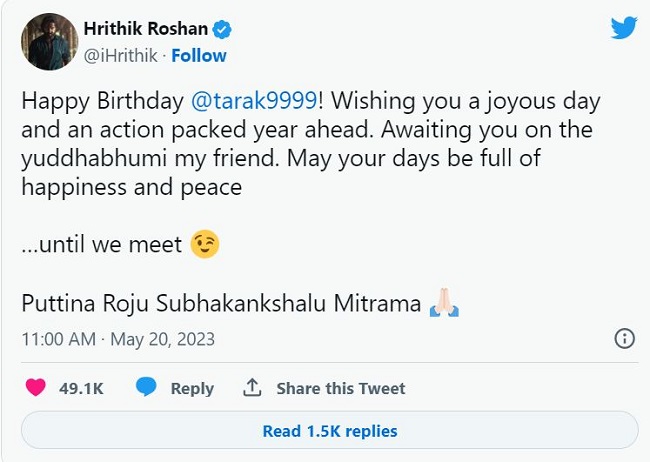 "पुट्टिना रोजू सुभकांक्षालू मित्रामा।" बधाई के साथ उन्होंने इस बात की भी जानकारी दी है कि वॉर 2 में जूनियर एनटीआर की अहम भूमिका होगी। ऋतिक रोशन ने लिखा है, "जूनियर एनटीआर को जन्मदिन की शुभकामनाएं। आपका दिन मंगलमय हो। आपका पूरा वर्ष एक्शन से भरपूर हो। युद्धभूमि में आपकी प्रतीक्षा कर रहा हूं मेरे दोस्त।"