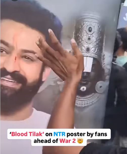 एक पैपराजी के इंस्टाग्राम पेज से वीडियो शेयर किया गया है जिसमें लोग वॉर 2 की रिलीज का जश्न मना रहे हैं। जूनियर एनटीआर के फैंस उनका पोस्टर लेकर झूम रहे हैं और पटाखे फोड़ते दिखाई दिए। वीडियो में एक फैन दिखा जिसने अपना अंगूठा काटकर खून से जूनियर एनटीआर के पोस्टर पर तिलक लगाया। जैसे ही वीडियो सोशल मीडिया पर वायरल हुआ, लोग हैरान रह गए।