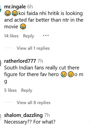 जैसे ही सोशल मीडिया पर लोगों ने यह वीडियो देखा, वे उन्हें लताड़ लगाने लगा। एक यूजर ने कहा, "भाई यह सिर्फ एक मूवी है। बहुत कॉमन है। इतनी अहमियत और क्यों?" एक ने कहा, "कोई फायदा नहीं है। ऋतिक रोशन दिखने और एक्टिंग में जूनियर एनटीआर से बहुत बेहतर हैं।" एक ने कमेंट किया, "जरूरी है? किस लिए?" एक और ने कहा, "बेरोजगारी।" कुछ यूजर्स स्पीचलेस इमोजी से अपना रिएक्शन दे रहे हैं।