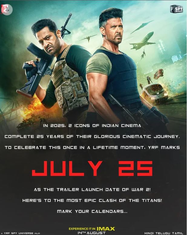 "साल 2025 में, इंडियन सिनेमा के दो आइकॉन अपने 25 साल का शानदार सफर पूरा कर रहे हैं।यशराज फिल्म्स इस लाइफटाइम मोमेंट को सेलिब्रेट करते हुए 25 जुलाई को वॉर 2 का ट्रेलर लेकर हाजिर हो रहा है। अपना कैलेंडर मार्क कर लें, क्योंकि दो सबसे बड़े हीरे टकराने वाले हैं"। मेकर्स ने ये भी बताया कि वॉर 2 हिंदी के अलावा तेलुगु और तमिल भाषा में भी रिलीज होगी।
