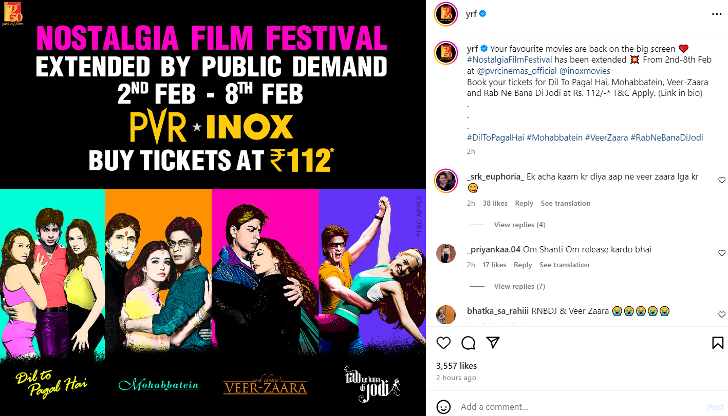 यशराज फिल्म्स ने अपने इंस्टाग्राम पर फिल्मों के पोस्टर शेयर करते हुए लिखा, आपकी पसंदीदा फिल्में बड़े पर्दे पर वापस आ गई हैं। #NostalgioFilmFestival को बढ़ा दिया गया है अब 2-8 फरवरी तक @pvrcinemas_official @inoxmovies पर इन दिल तो पागल है, मोहब्बतें, वीर-ज़ारा और रब ने बना दी जोड़ी के लिए अपने टिकट रु. 112/ में बुक करें।