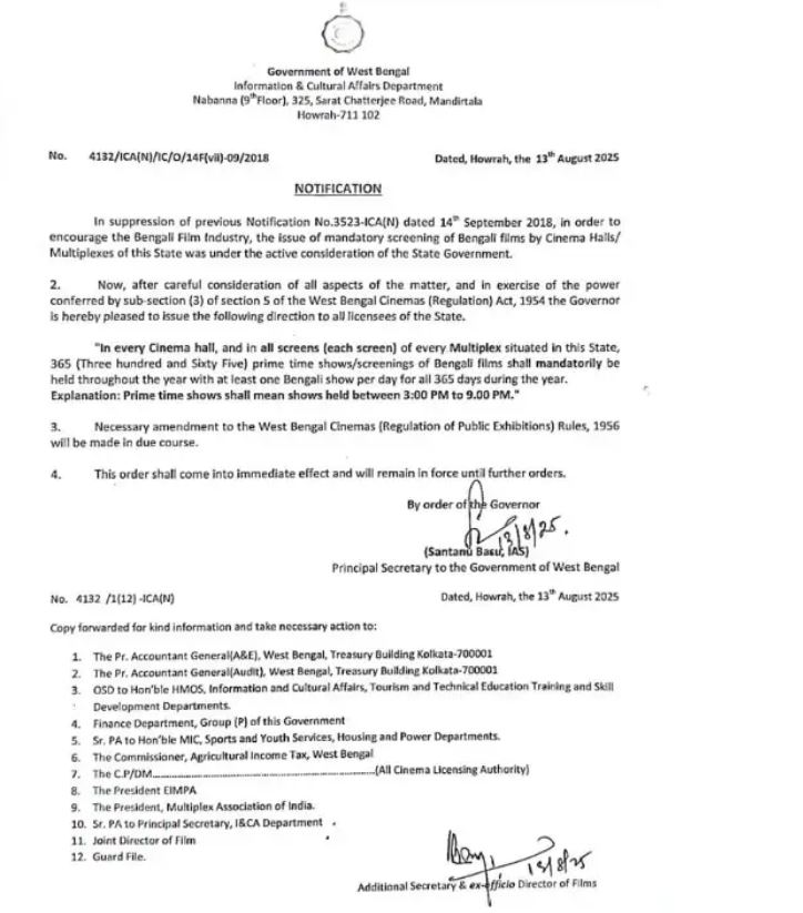 वेस्ट बंगाल की सरकार के एक पत्र के मुताबिक, हर सिनेमाहॉल की हर स्क्रीन पर,राज्य में जितने भी मल्टीप्लेक्स हैं उसमें 365 डेज प्राइम टाइम शो स्क्रीनिंग में पूरे साल बंगाली फिल्मों को दिखाना अनिवार्य है। साल के 365 दिन में एक बंगाली फिल्म थिएटर में चलाने का सरकार ने आदेश दिया है।