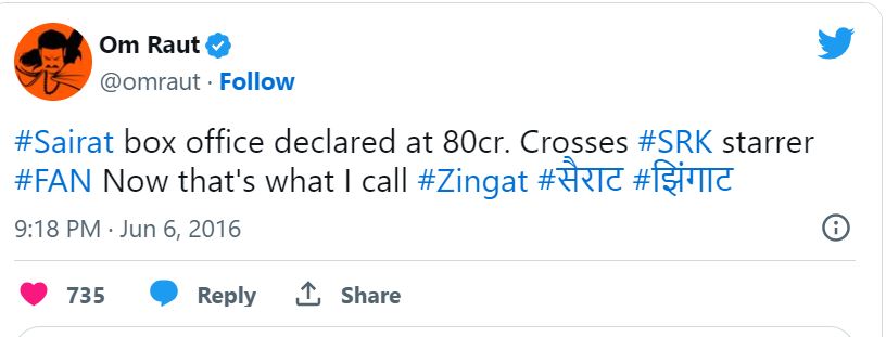 6 जून 2016 को किए गए ट्वीट में ओम राउत ने कहा था- "सैराट का बॉक्स ऑफिस 80 करोड़ घोषित किया गया और SRK स्टारर फैन को पार कर गया। अब इसे ही मैं जिंगाट कहता हूं।" 'आदिपुरुष' को मिल रही आलोचनाओं के बीच ओम राउत का ये पुराना ट्वीट सोशल मीडिया पर जमकर वायरल हो रहा है। अब इस ट्वीट के जरिए शाह रुख के फैंस ओम राउत को आइना दिखा रहे हैं।