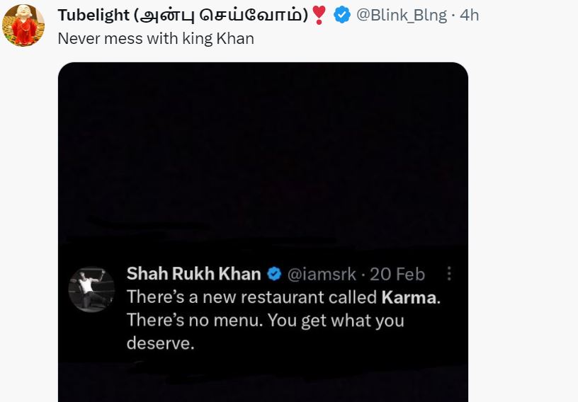 एक यूजर ने शाह रुख खान का पुराना ट्वीट शेयर किया है, जिसमें उन्होने कहा था, "एक नया रेस्तरां है, जिसे कर्म कहा जाता है। यहां कोई मेन्यू नहीं होता है। तुम्हें वही मिलता है, जो तुम डिजर्व करते हो।" इसे शेयर कर यूजर ने लिखा- "किंग खान से कभी मत उलझो।"