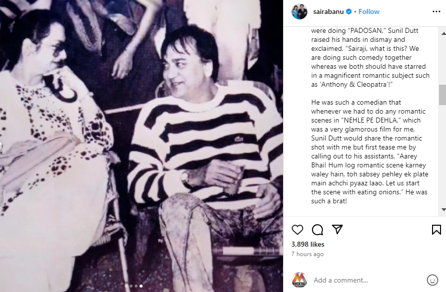 इन खूबसूरत यादों को शेयर करने के साथ ही उन्होंने फैंस के साथ 'नहले पे दहला' की शूटिंग के दौरान का एक मजेदार किस्सा शेयर करते हुए बताया कि रोमांटिक सीन शूट करने से पहले सुनील दत्त ने प्याज मंगवाया था। सायरा बानों ने कैप्शन में लिखा, "वह बहुत बड़े कॉमेडियन थे।
