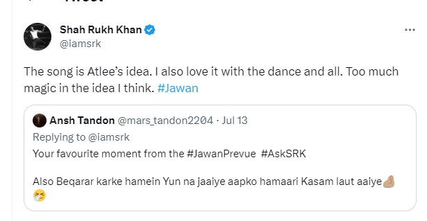 'जवान' फिल्म पठान के बाद शाह रुख खान की इस साल की दूसरी बिग बजट मूवी होगी। यह डायरेक्टर एटली कुमार की डेब्यू बॉलीवुड मूवी भी होने वाली है। ऐसे में फिल्म के जरिये ज्यादा से ज्यादा लोगों का ध्यान खींचने के लिए उन्होंने कोई कसर नहीं छोड़नी चाही है। किंग खान ने कुछ दिनों पहले आस्क एसआरके सेशन किया था, जिसमें उन्होंने बताया कि फिल्म में 'बेकरार करके हमें' डांस के एड करने का आइडिया एटली कुमार का था। वहीं, हिंदुस्तान टाइम्स की रिपोर्ट के अनुसार, इसे खुद शाह रुख खान ने कोरियोग्राफ किया है।