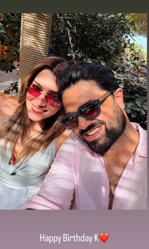 हाल ही में, कृति सेनन ने अपना 35वां जन्मदिन मनाय और इस खास मौके पर उनके रूमर्ड ब्वॉयफ्रेंड कबीर बहिया ने उनके साथ एक अनदेखी 'सनकिस्ड' सेल्फी शेयर की जो उनके रिश्ते की अटकलों को और हवा मिल गई है। तस्वीर में दोनों मुस्कुराते हुए और एक साथ खुश दिख रहे हैं। इस फोटो के साथ कबीर ने कैप्शन में हार्ट इमोजी के साथ बर्थडे विश किया है।