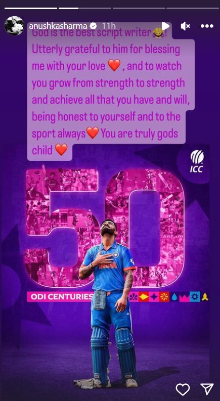 उन्होंने अपनी इंस्टा स्टोरी पर एक फोटो शेयर की, जिसमें विराट कोहली ऊपर की तरफ देखते हुए भगवान का शुक्रिया अदा कर रहे हैं और उनके पीछे 50 ODI सेंचुरी लिखा हुआ है। अनुष्का शर्मा ने इस फोटो के साथ कैप्शन देते हुए लिखा, "भगवान सबसे अच्छा स्क्रिप्ट राइटर है। मैं उनकी बहुत ही शुक्रगुजार हूं कि उन्होंने मुझे तुम्हारे प्यार से नवाजा है"।