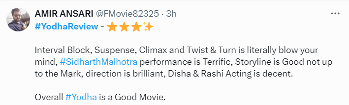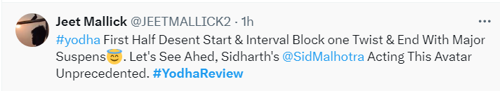 दूसरे यूजर ने लिखा, "योद्धा के पहले हाफ की शुरुआत डिसेंट हुई है, फिल्म में ट्विस्ट दिखाया गया है और सस्पेंस अब भी बरकरार है। आगे देखते हैं, सिद्धार्थ मल्होत्रा ऐसी एक्टिंग कर सकते हैं किसी ने सोचा नहीं होगा"।
