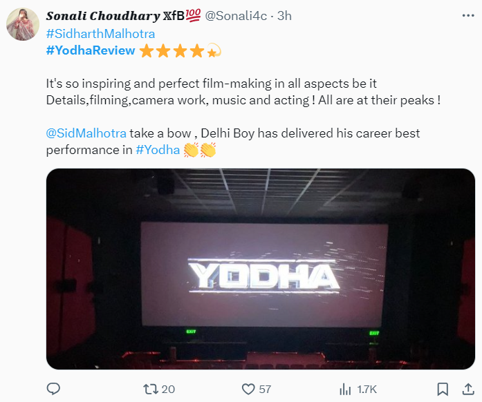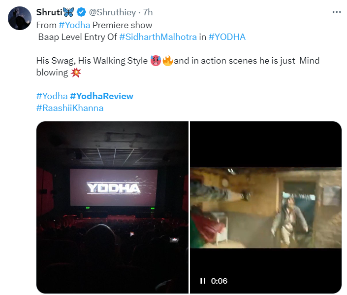 एक और सिनेमाघर में योद्धा एन्जॉय कर रहे दर्शक ने ट्वीट करते हुए लिखा, "सिद्धार्थ मल्होत्रा की योद्धा में बाप लेवल एंट्री है। उसका स्वैग से लेकर चलने का अंदाज और फिल्म में एक्शन सीन्स बहुत ही शानदार है"।