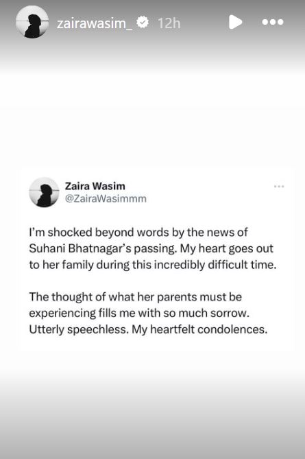जायरा वसीम ने सोशल मीडिया पर एक पोस्ट शेयर कर सुहानी के निधन पर शोक जाहिर किया है। पूर्व एक्ट्रेस ने लिखा, "सुहानी भटनागर के निधन से मैं इतना हैरान हूं कि इसे शब्दों में बयां नहीं कर सकती। इस मुश्किल घड़ी में मैं परिवार को संवेदना देती हूं। उनके माता-पिता पर क्या बीत रही होगी, यह सोचकर मेरा दिल दुख से भर जाता है। मैं स्पीचलेस हूं।"