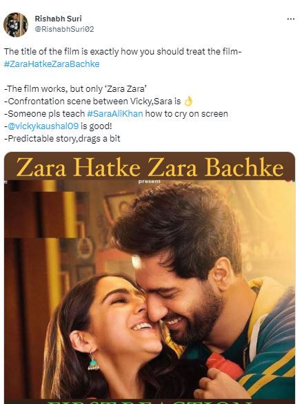 सिनेमाघर से फिल्म देखकर निकले एक यूजर ने लिखा, "फिल्म का टाइटल बिल्कुल वैसा ही है, जैसी ये फिल्म है। ये फिल्म वर्क करेगी, लेकिन जरा-जरा। सारा और विक्की के बीच के सीन्स को बहुत ही अच्छी तरह से फिल्माया गया है। कोई प्लीज सारा अली खान को सिखाओ की ऑनस्क्रीन कैसे रोते हैं।