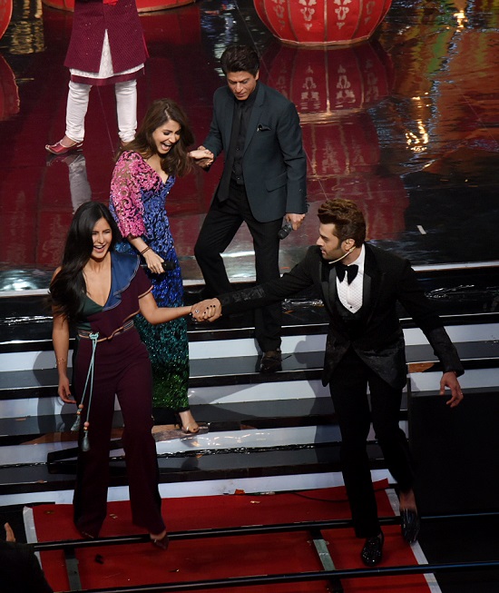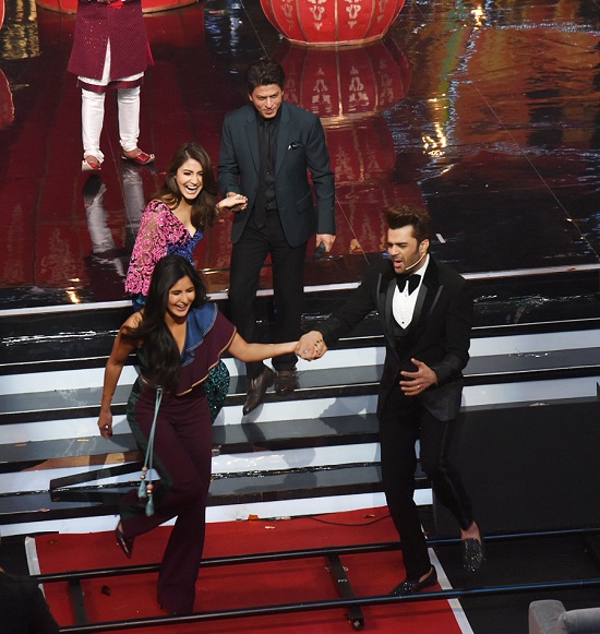 आप देख सकते हैं कैसे मनीष पॉल कटरीना का हाथ थामे उन्हें लेकर मंच से नीचे ले जा रहे हैं। जबकि शाह रुख़ ने अनुष्का शर्मा का हाथ थामा हुआ है।
