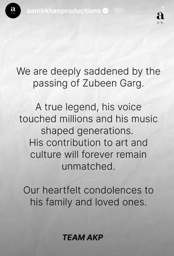 आमिर खान की तरफ से उनके प्रोडक्शन कंपनी आमिर खान प्रोडक्शंस पेज पर एख पोस्ट शेयर किया गया है जिसमें जुबीन के निधन पर श्रद्धांजलि दी गई है। पोस्ट में कहा गया है, "ज़ुबीन गर्ग के निधन से हमें गहरा दुख हुआ है। वह एक महान कलाकार थे, उनकी आवाज लाखों लोगों को छूती थी और उनका संगीत कई पीढ़ियों को प्रभावित करता रहा। कला और संस्कृति के क्षेत्र में उनका योगदान हमेशा अद्वितीय रहेगा। हम उनके परिवार और प्रियजनों के प्रति अपनी गहरी संवेदना व्यक्त करते हैं। टीम AKP।"