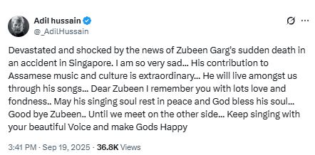 आदिल हुसैन ने जुबिन गर्ग को याद करते हुए लिखा, "जुबीन गर्ग के सिंगापुर में एक्सीडेंट से हुई मौत की खबर से पूरी तरह मैं टूट चुका हूं। उनका असम म्यूजिक और कल्चर में विशेष योगदान रहा है। वह अपने गानों के माध्यम से हमारे दिलों में रहेंगे। डियर जुबिन मैं तुम्हें प्यार और दयालु इन्सान के रूप में हमेशा याद रखूंगाय़ गुड बाय जुबिन"।
