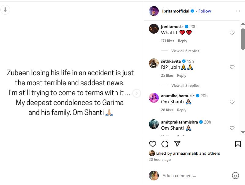 प्रीतम दा जिनके साथ जुबिन गर्ग ने गैंगस्टर का या अली गाना गाया था, उन्होंने सिंगर के निधन की खबर पर रिएक्ट करते हुए लिखा, "जुबिन ने एक एक्सीडेंट में अपनी जान गंवा दी ये सबसे दुख देने वाली और बुरी खबर है। मैं अभी भी इससे डील करने की कोशिश कर रहा हूं। गरिमा और उनके परिवार संग मेरी संवेदनाएं हैं। ओम शांति"।