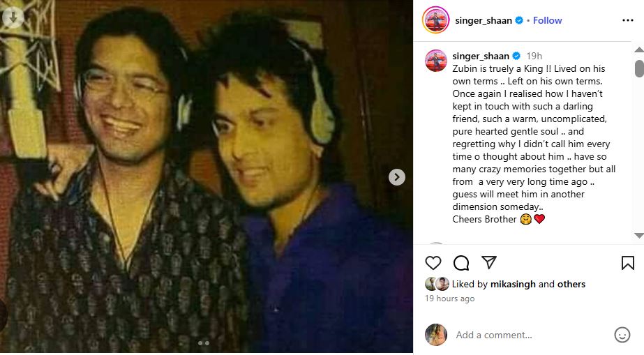 सिंगर शान ने दुख व्यक्त करते हुए लिखा, "जुबिन सच में एक किंग था, जो सिर्फ अपनी शर्तों पर जिया और अपनी शर्तों पर ही चला गया। मुझे अब ये एहसास हो रहा है कि मैं इतने अच्छे दोस्त के साथ टच में नहीं था। वह बहुत ही प्यारे, उलझनों से दूर रहने वाले और प्योर हार्टेड शख्स थे। मुझे अफसोस है कि मैंने उनके बारे में सोचा तो उन्हें फोन क्यों नहीं किया। हम दोनों की साथ में बहुत अच्छी मेमोरी हैं। लगता है किसी दिन उनसे किसी और तरह से मिलेंगे..चीयर्स माय फ्रेंड"।