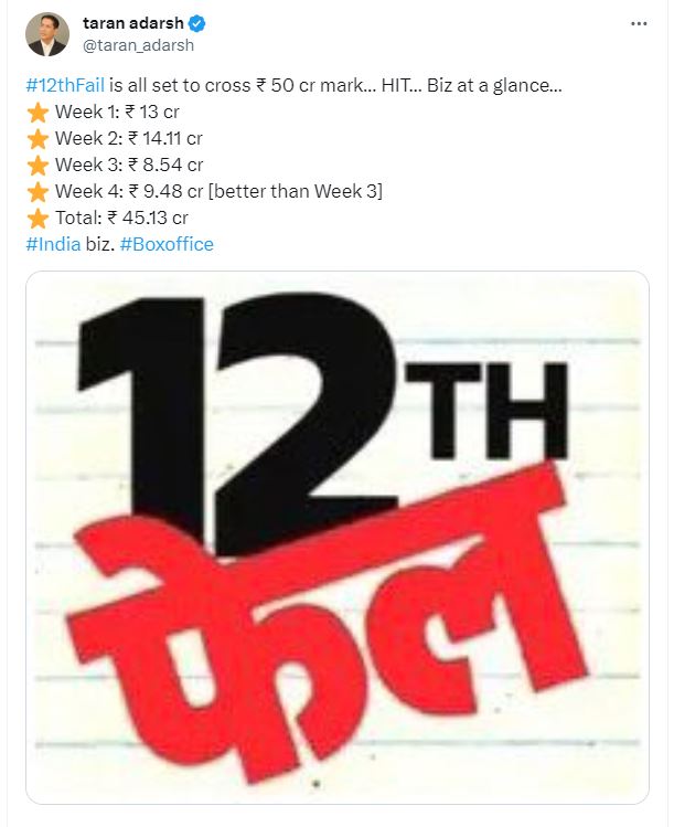 दूसरे हफ्ते में फिल्म ने 14.11 करोड़, तीसरे हफ्ते में 8.54 करोड़ की कमाई की। हालांकि, तीसरे हफ्ते के मुकाबले इस फिल्म का चौथा हफ्ता काफी सॉलिड गया। सलमान खान की टाइगर 3 की मौजूदगी में इस मूवी ने चौथे वीक में टोटल 9.48 करोड़ का वीकली बिजनेस किया। घरेलू बॉक्स ऑफिस पर ये 12th फेल अब तक 45.13 करोड़ रुपए की कमाई कर चुकी है और 50 करोड़ का आंकड़ा पार करने के लिए तैयार है।