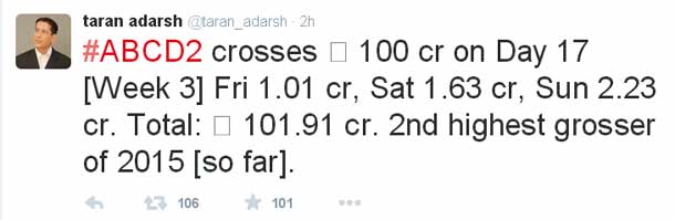 कल फिल्म ने 2.23 करोड़ का कलेक्शन किया। व्यापार विश्लेषक तरण आदर्श ने ट्विटर पर फिल्म के कलेक्शन की जानकारी दी। उन्होंने ट्वीट किया, 'एबीसीडी 2 ने 17वें दिन(तीसरा हफ्ता) 100 करोड़ का आंकड़ा पार किया। शुक्रवार को 1.01 करोड़, शनिवार को 1.63 करोड़, रविवार को 2.23 करोड़। कुल 101.91 करोड़। 2015 की सबसे ज्यादा कमाने वाली फिल्म।'