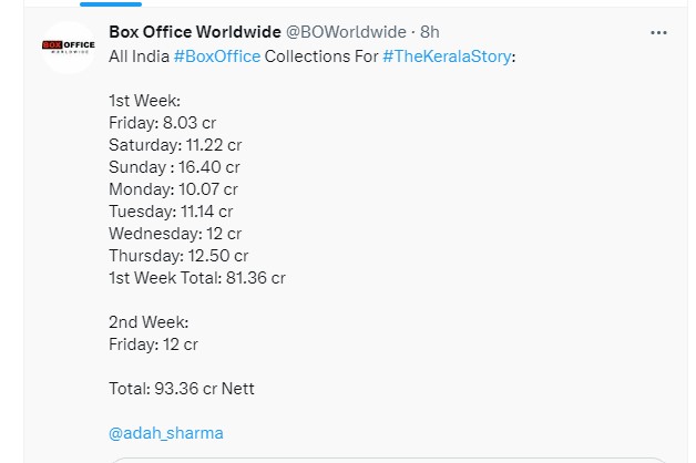 ट्रेड एक्सपर्ट तरण आदर्श के अनुसार, द केरल स्टोरी के पहले हफ्ते की कमाई को देखें, तो अंदाजा लगाया जा सकता है कि फिल्म 250 करोड़ की कमाई कर सकती है। पूरे भारत की पसंद बनी यह फिल्म वर्ल्डवाइड 37 देशों में रिलीज हो चुकी है। जबकि कई प्रदेशों में इसे टैक्स फ्री कर दिया गया है। इस बीच आइये जानते हैं कि आठवें दिन तक फिल्म ने कितने कमा लिए।