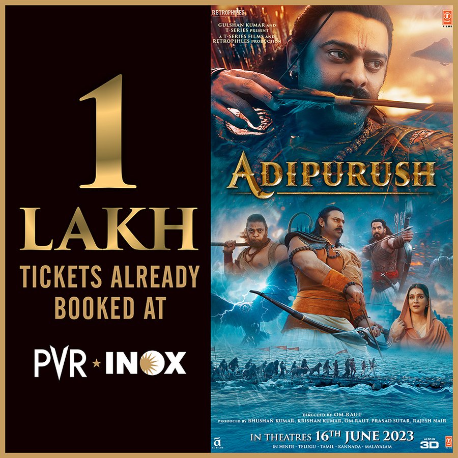 देश की प्रमुख मल्टीप्लेक्स चेन पीवीआर आइनोक्स सिनेमाज ने मंगलवार को बताया कि फिल्म के एक लाख टिकट पहले ही बुक हो चुके हैं। 'आदिपुरुष' का निर्देशन ओम राउत ने किया है। 16 जून को फिल्म तेलुगु के अलावा तमिल, मलयालम, कन्नड़ और हिंदी भाषाओं में रिलीज की जा रही है।
