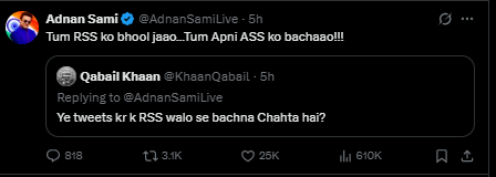 उनके इस पोस्ट के बाद उन्हें ट्रोल करते हुए एक शख्स ने लिखा, "ये ट्वीट करके ये RSS वालों से बचना चाहता है"। जिसका जवाब देते हुए अदनान सामी ने लिखा, "तुम आरएसएस को भूल जाओ, आप अपनी ASS बचाओ"।