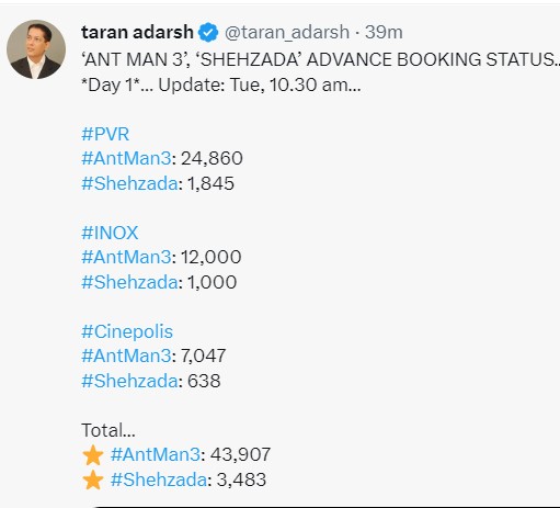 फिल्म क्रिटिक तरण आदर्श ने शहजादा और साथ ही एंट मैन का एडवांस बुकिंग स्टेटस शेयर किया है। पीवीआर में शहजादा के 1845, आईनॉक्स में 1000 और सिनेपॉलिस में 638 टिकट बिके हैं। कुल मिलाकर फिल्म के 3,483 टिकट बिके हैं।