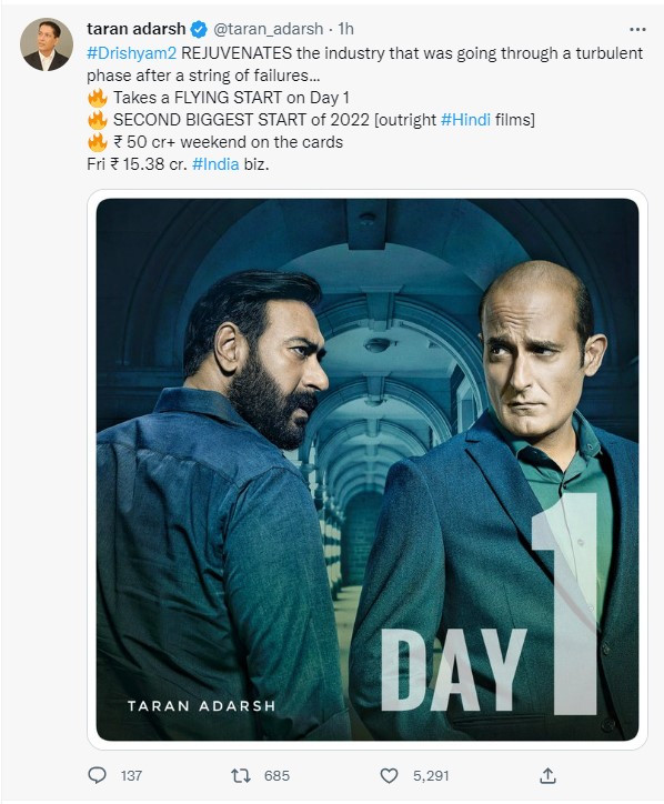 पहले दिन का रिस्पांस देखते हुए ट्रेड एनालिस्ट तरण आदर्श ने प्रेडिक्ट किया है कि यह फिल्म वीकेंड तक 50 करोड़ का आंकड़ा पार कर जाएगी। उन्होंने कहा, '#Drishyam2 ने असफलताओं की श्रृंखला से गुजर रहे बॉलीवुड में फिर से जान भरी है। पहले दिन शानदार ओपनिंग की। यह फिल्म 2022 की दूसरी सबसे बड़ी ओपनर है। वीकेंड तक 50 करोड़ प्लस का कारोबार करेगी। पहले दिन 15.38 करोड़ का कलेक्शन किया। #India biz'