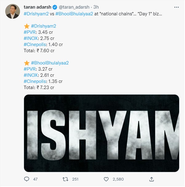 'दृश्यम 2' एक-एक कर इस साल अच्छा कलेक्शन करने वाली सभी फिल्मों के रिकॉर्ड तोड़ती जा रही है। इस वर्ष गर्मियों में रिलीज की गई कार्तिक आर्यन की ब्लॉकबस्टर मूवी 'भूल भुलैया 2' ने आते ही बॉक्स ऑफिस पर धमाका कर दिया था। ट्रेड एनालिस्ट तरण आदर्श ने बताया कि नेशनल चेन्स में 'दृश्यम 2' ने 'भूल भुलैया 2' का भी रिकॉर्ड तोड़ दिया है। उन्होंने बताया, '#Drishyam2- #PVR: 3.45 करोड़ #INOX: 2.75 करोड़ #Cinepolis: 1.40 करोड़ कमाए। टोटल कलेक्शन 7.60 करोड़ का हुआ। #BhoolBhulaiya2- #PVR: 3.27 करोड़ INOX: 2.61 करोड़ #Cinepolis: 1.35 करोड़ कमाए। टोटल कलेक्शन 7.23 करोड़ का हुआ।'