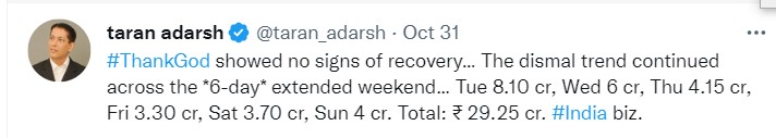 ईद के मौके पर अजय देवगन की रनवे 34 रिलीज हुई थी, जो कि फ्लॉप थी। अब दिवाली के मौके पर थैंक गॉड रिलीज हुई है। 70 करोड़ के बजट से बनी इस फिल्म को इंद्र कुमार ने डायरेक्ट किया है। इस फिल्म को न तो वीकेंड का फायदा मिला और न ही दिवाली का। पहले दिन 8.1 करोड़ की कमाई करने के बाद ही इसकी कमाई में गिरावट देखी गई। कह सकते हैं कि पहले दिन जैसा कमाल यह फिल्म दूसरे दिन से लेकर अब तक नहीं दिखा पाई है।
