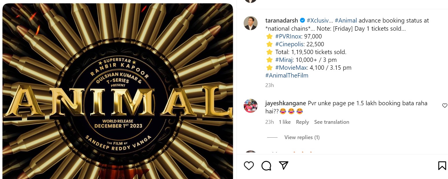 मिराज सिनेमा में सोमवार दोपहर 3 बजे तक एनिमल के 10000 टिकट बिक चुके है। वहीं, मूवी मैक्स में 4100 टिकट की बिक्री हुई है। इसके साथ ही इन चार नेशनल चेन में एनिमल ने ओपनिंग डे के लिए अब तक 133600 टिकट बिक चुके है।