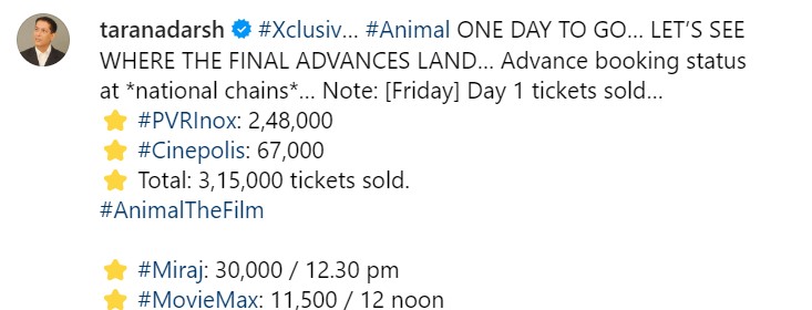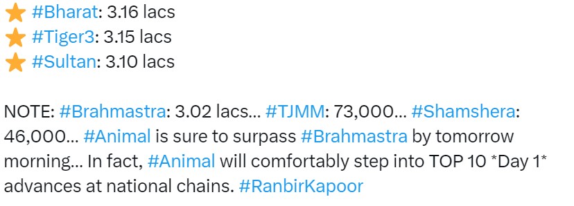 गुरुवार दोपहर तक नेशनल चेन में 'एनिमल' की कुल 3 लाख 15 हजार टिकटों की एडवांस बुकिंग हो गई है, जोकि एक शानदार आंकड़ा माना जा रहा है। इसके साथ ही रणबीर कपूर की इस मूवी एडवांस बुकिंग के मामले में सलमान खान की 'सुल्तान' मूवी को पछाड़ दिया है। जबकि आज शाम तक 'एनिमल' भाईजान की 'टाइगर 3' और 'भारत' को भी मात दे देगी।
