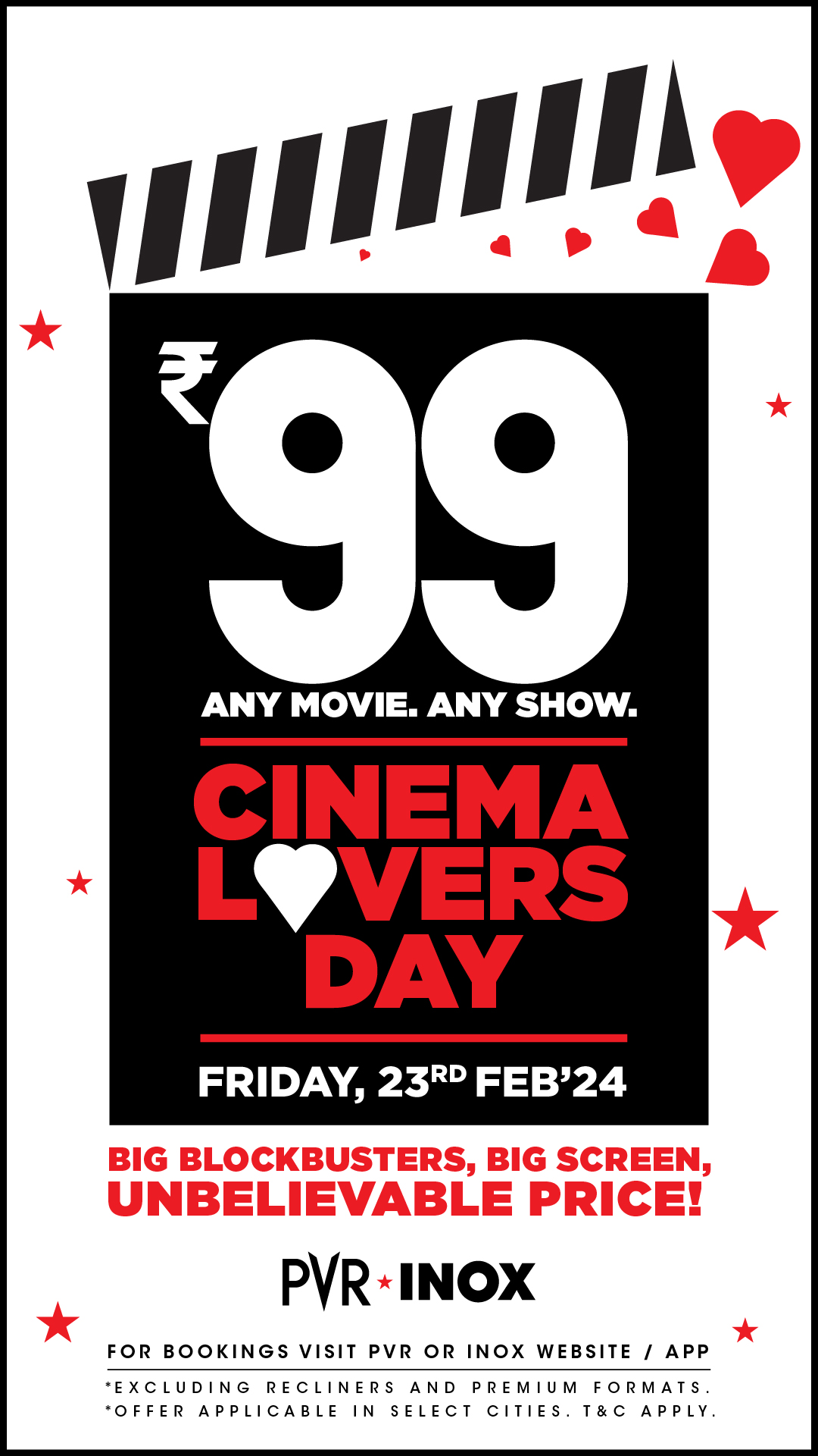 एंटरटेनमेंट डेस्क, नई दिल्ली। शुक्रवार को मल्टीप्लेक्स चेन पीवीआर आइनॉक्स में सिनेमा लवर्स डे (Cinema Lovers Day) मनाया जा रहा है, जिसके तहत सभी फिल्मों के टिकटों के दाम घटा दिये गये हैं। पीवीआर की ओर से जारी की गई जानकारी के अनुसार, 23 फरवरी को हर फिल्म के टिकट की कीमत 99 रुपये रहेगी। इसमें प्रीमियम फॉरमेट्स और रेक्लाइनर्स शामिल नहीं हैं।