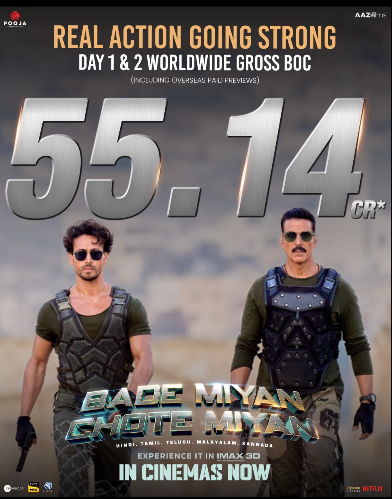 फिल्म की प्रोडक्शन कंपना पूजा एंटरटेनमेंट की तरफ से वर्ल्डवाइड आंकड़े शेयर किए गए हैं। 'बड़े मियां छोटे मियां' ने दो दिन में 55.14 करोड़ का ग्रॉस कलेक्शन कर डाला है।