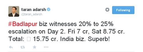 व्यापार विश्लेषक तरण आदर्श ने ट्विटर पर फिल्म के कलेक्शन की जानकारी दी। उन्होंने ट्वीट किया, 'दूसरे दिन बदलापुर के बिजनेस में 20 से 25 फीसदी की बढो़तरी हुई। शुक्रवार को 7 करोड़, शनिवार को 8.75 करोड़। भारत में कुल 15.75 करोड़ का बिजनेस किया। शानदार।'