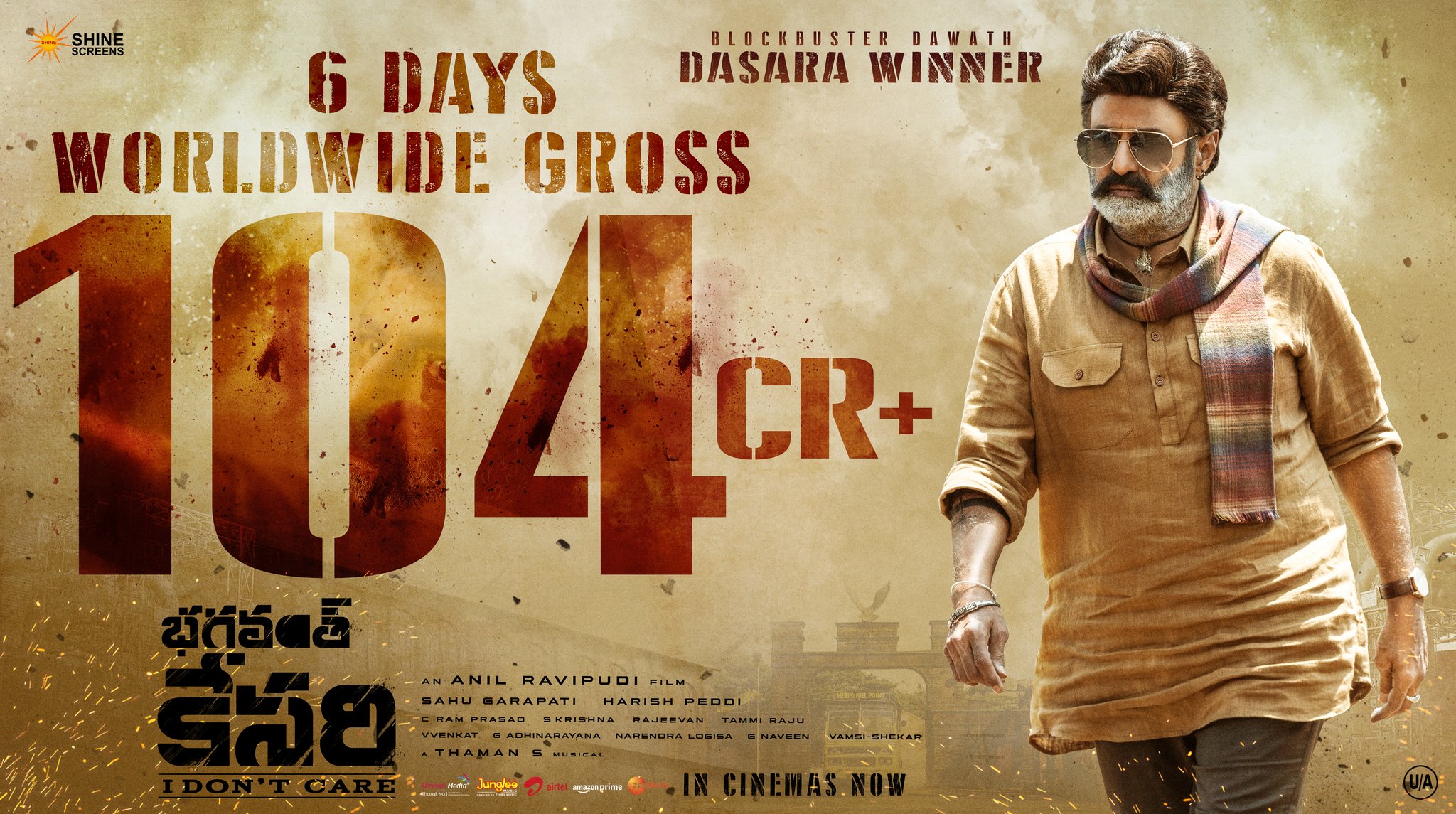 तेलुगू फिल्म प्रोडक्शन हाउस साइन स्क्रीन्स ने अपने ऑफिशियल ट्विटर हैंडल पर 'भगवंत केसरी' के दुनियाभर में कमाई के आंकड़ो को शेयर किया है। इस ट्वीट के मुताबिक नंदमुरी बालकृष्ण की 'भगवंत केसरी' ने रिलीज के 6 दिन के भीतर वर्ल्डवाइड 104 करोड़ का कलेक्शन कर डाला है।