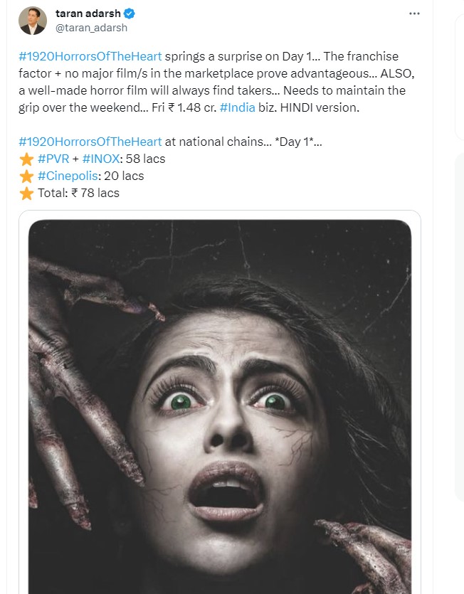 फिल्म क्रिटिक तरण आदर्श ने ट्वीट कर जानकारी दी, '#1920HorrorsOfTheHeart ने पहले दिन सरप्राइजिंग कलेक्शन किया है...फ्रेंचाइजी फैक्टर और किसी बड़ी फिल्म का मार्केट में न होना इस फिल्म के लिए फायदेमंद साबित हुआ। अच्छे से बनी हॉरर फिल्म हमेशा ऑडियंस खींच लेती है...इसी रफ्तार को वीकेंड पर भी बनाए रखने की जरूरत है... शुक्रवार को 1.48 करोड़ का कलेक्शन किया। यह इंडियन कलेक्शन है। हिंदी वर्जन।'